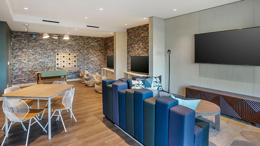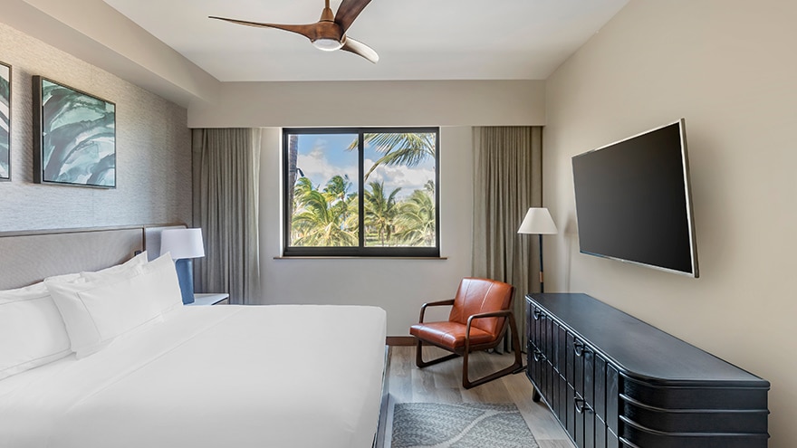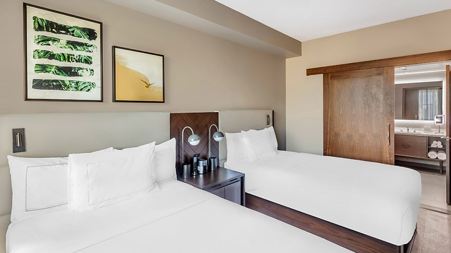 Spacious 2-bedroom/2-bathroom suites with an open lanai area and balcony. The primary bedroom features a king-size bed, 55" TV and a desk. The bathroom includes a single-sink vanity, separate toilet room, backlit mirror and walk-in shower with wall-mounted rain shower head. The second bedroom is furnished with two full-size beds, a 65" TV and a guest bathroom with the same features as the primary. The suite’s living room has a sofa bed, 65" TV and dining table. Fully equipped kitchen, and washer/dryer.