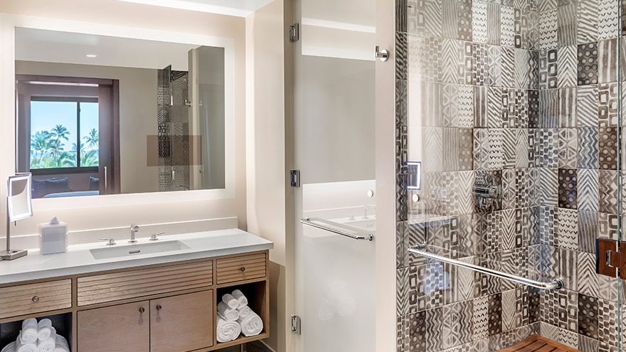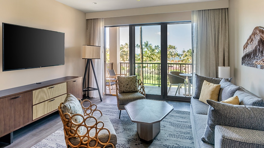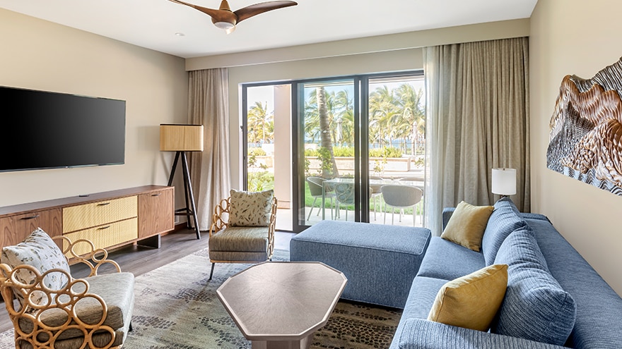 Spacious 1-bedroom/1-bathroom suites with an open lanai area and balcony. The primary bedroom features a king-size bed or two double beds, 55" TV and a desk. The bathroom includes a single-sink vanity, separate toilet room, backlit mirror and walk-in shower with wall-mounted rain shower head. The suite’s living room has a sofa bed, 65" TV and dining table. Fully equipped kitchen, and washer/dryer.