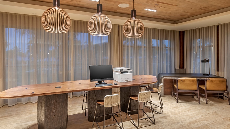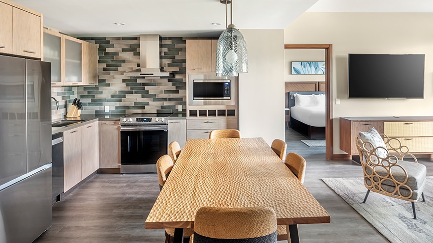 3-Bedroom Suites have a king-size bed in the primary bedroom, another king-size bed in the secondary bedroom and two double beds in the third bedroom. There are three well-appointed bathrooms and a spacious living area with a sleeper sofa, 65-inch TV and dining table for eight. The kitchen has a refrigerator, microwave, dishwasher, cooktop and oven. Some Suites also have a built-in wine cooler. Additional special features include a washer and dryer and a furnished balcony with ocean views.