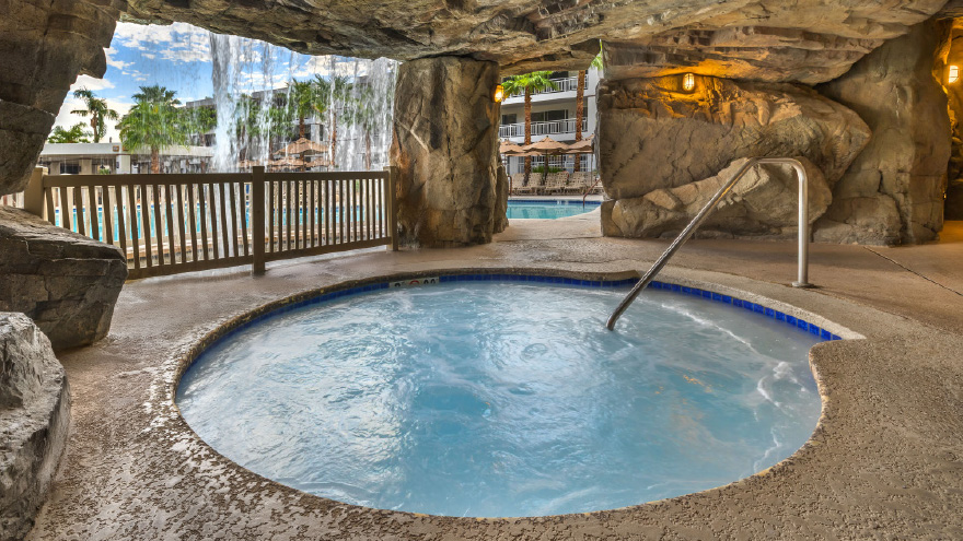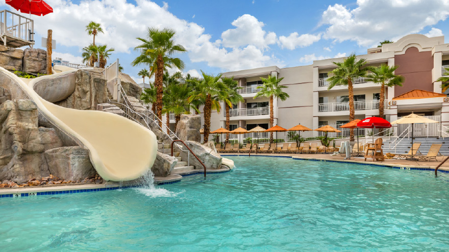 Spend time at the sparkling pool with a waterslide, or unwind in the hot tub and sauna. Schedule a treatment at the on-site spa, work up a sweat at the fitness center or play a game on the basketball court. End the day on your patio or balcony during a spectacular desert sunset.